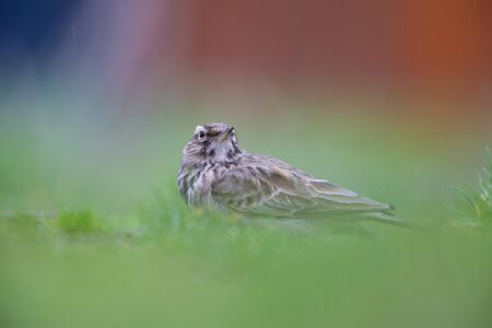 Lateral view of a Crested Lark resting in a city center of The Netherlands. In a urban area with a colorful background.