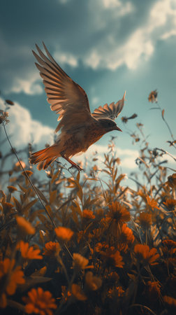 a bird soars gracefully through the air, its wings outstretched in a magnificent display. bathed in a golden light, the image captures the bird's multilayered dimensions with a touch of subtle irony. shot with a zeiss batis 18mm f2.8 lens, the photo exudes a soft realism, showcasing a beautiful contrast between dark yellow and light bronze tones. ai generated
