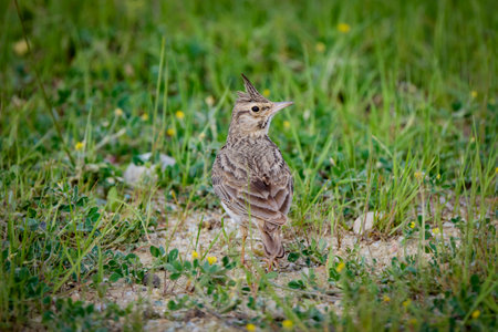 Rare Crested lark (Galerida cristata) in Vaasa, Finland. walking on the ground in spring.