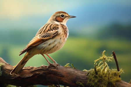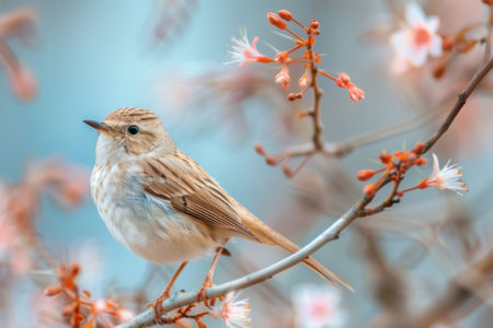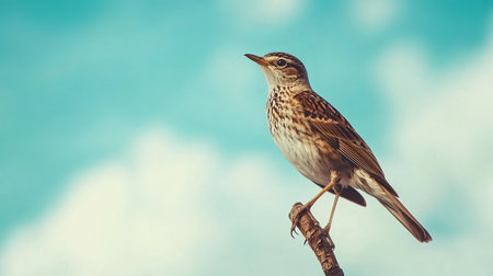 A charming bird perched gracefully on a branch, showcasing its delicate feathers against a soft, blurred sky. The tranquil scene captures the essence of nature's beauty.