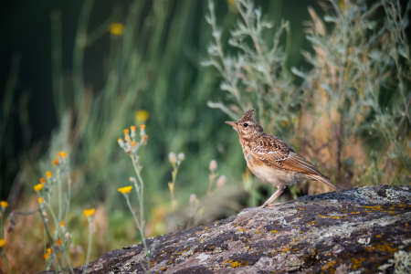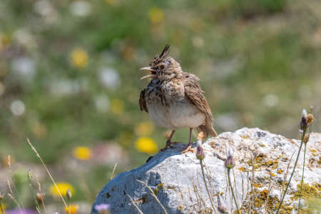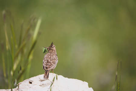 Beautiful Crested lark (Galerida cristata) sits on rocks on green grass nature background