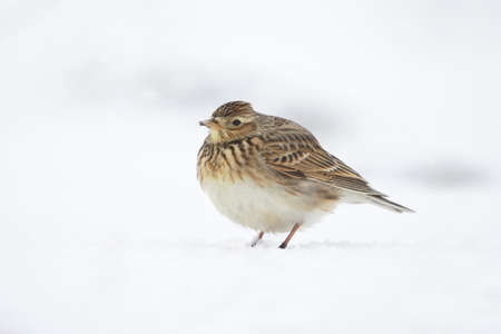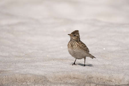 Eurasian skylark (Alauda arvensis) standing in snow.