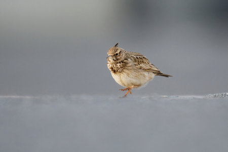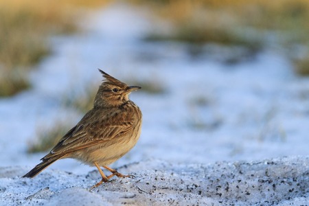 A crested lark (Galerida cristata) resting and foraging in a frozen meadow in the morning light