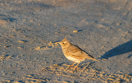 The crested lark or Galerida cristata common small grey brown bird with forelock on the sunny beach.