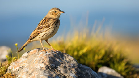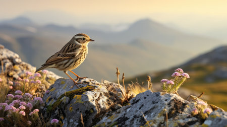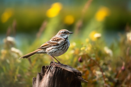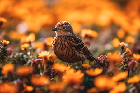 The bird sits on the grass among the flowers. Generative AI illustrator