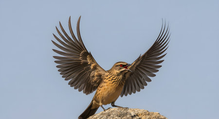 A Cape Rockjumper bird is perched on a rock against a clear sky, captured in a dramatic pose with its wings spread wide open. Its beak is open as if it is singing or calling out, showcasing its beautiful feather patterns and dynamic posture. This striking wildlife photograph captures a powerful moment in nature.
