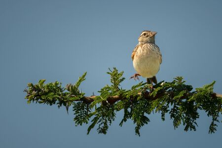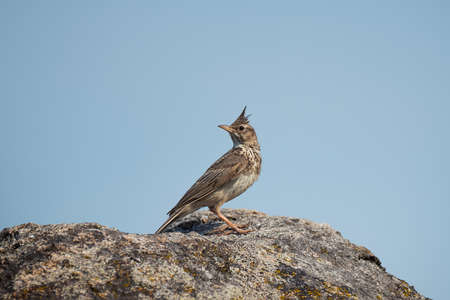 Beautiful Crested lark (Galerida cristata) sits on rocks on blue sky background