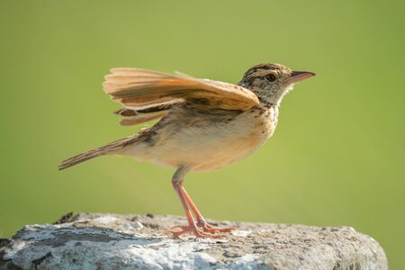 Indochinese Bushlark(Mirafra erythrocephala ), brown bird on the prowl in grassland with green background.