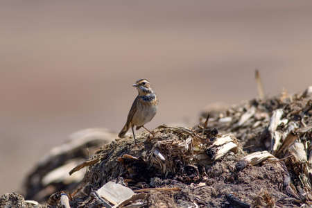 A female Bluethroat, Luscinia calliope, perched on a tree stump.