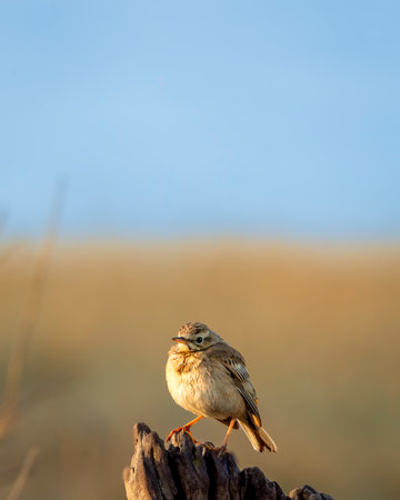 Paddyfield pipit or Oriental pipit or Anthus rufulus bird portrait perched in winter season morning safari at dhikala zone of jim corbett national park forest tiger reserve uttarakhand india asia