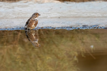 Common linnet standing near a muddy puddle on wet reddish terrain in nature