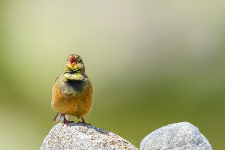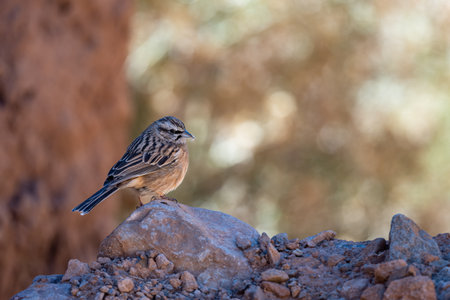 Rock Bunting, Emberiza Cia. A common bird in a rocky mountain landscape.