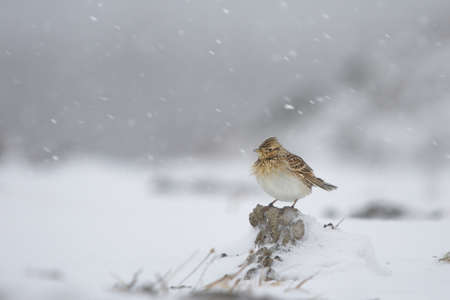 Eurasian skylark (Alauda arvensis) standing in heavy snowfall.