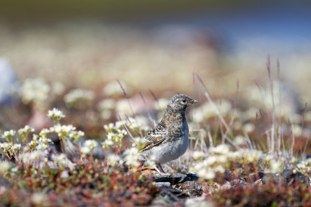 Immature horned lark or shore lark standing between plants in Canadas arctic