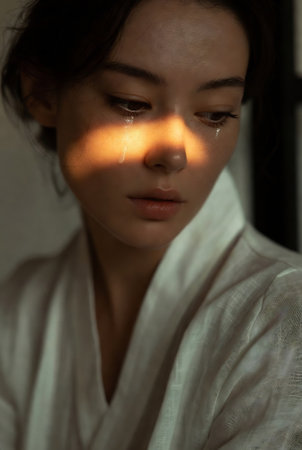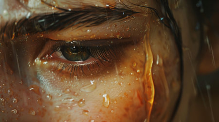 A person gazes pensively, tears glistening along their skin in dramatic lighting, evoking deep emotions.