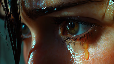 A close-up shot captures a womans eye filled with tears, highlighting the intricate details of her eyelashes and the emotion conveyed through her gaze. The moment reflects sadness and vulnerability.