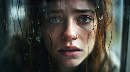 Close-up portrait captures a young woman with tear-streaked cheeks and expressive, hopeful eyes, symbolizing strength and resilience against adversity. Her emotional depth is palpable.