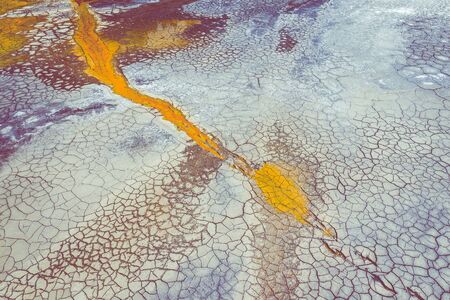 Aerial view of surrealistic industrial place. Dry surface. Desertic landscape. Human impact on the environment. View from above. Abstract industrial background.