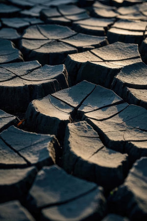 Captivating view of dry cracked earth illuminated by warm sunlight at dusk. This image highlights textures and environmental concerns related to climate change.
