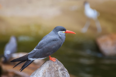 The Inca tern Larosterna inca bird has dark gray body, white mustache and red-orange beak and feet. Breeds on the coast of Peru, Chile and Ecuador South America.