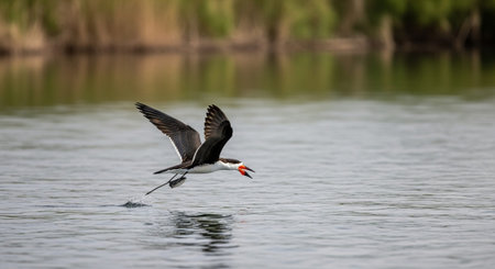 A Black Skimmer flies low over the water with two tiny minnows in its beak as other fish splash out of the water trying to escape being caught in the golden morning sunlight.