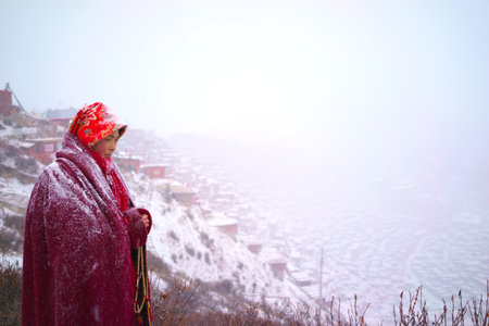 Man travels in the Tibetan Buddhist Academy in snowy days, Sichuan, China