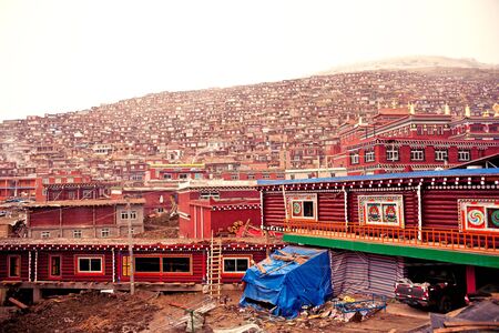 Student residency for nuns and monks at Larung Gar Buddhist Academy in Sertar, Sichuan, China. Tibetan region of Garze - Unique red painted houses in the high altitude mountainous Tibetan plateau