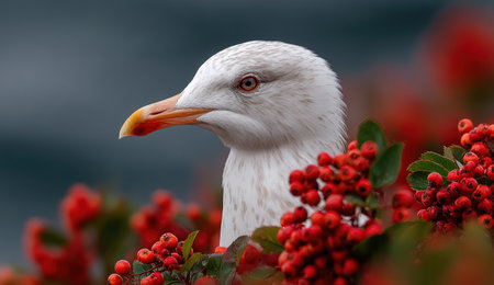 Close-up of a seagull with white plumage and orange bill, surrounded by clusters of bright red berries, highlighting the beauty of wildlife in a natural setting