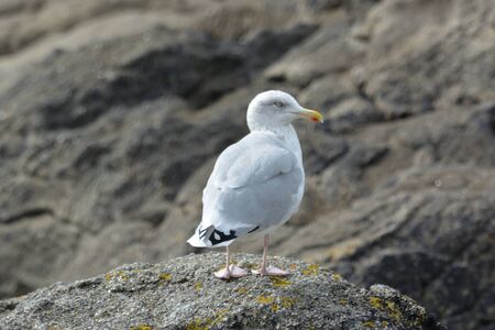 Closeup of young seagull at the Ring of Kerry, Ireland. Portrait of a sea gull sitting on a pier.