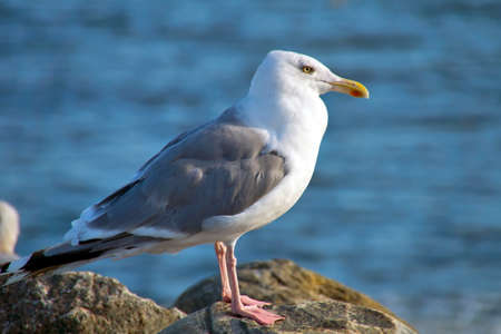 Seaside water animals concept. Closeup of seagull bird standing next to water