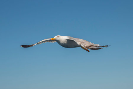 European Herring Gull in flight with blue skies in the background
