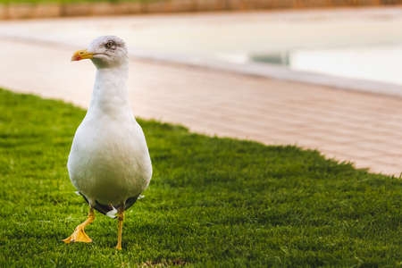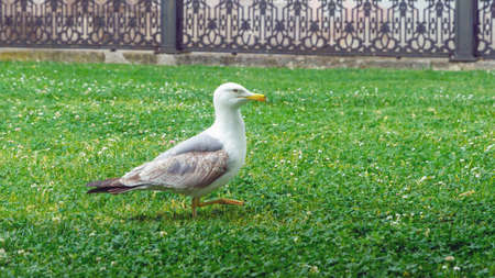 Seagull european herring gull walking on the ground, Seabird white and gray color, side closeup view