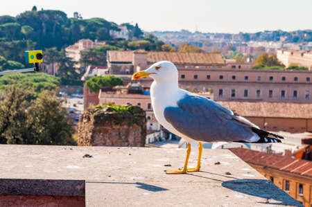 A large sea gull sits on the parapet against the background of attractions in Rome, Italy