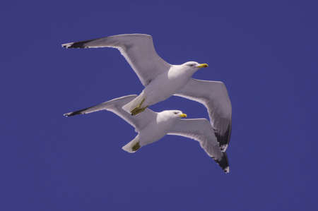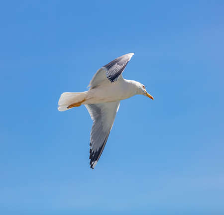 Sea gull flies in the clear blue sky. The European herring gull, Larus argentatus, flying in the clear blue sky.