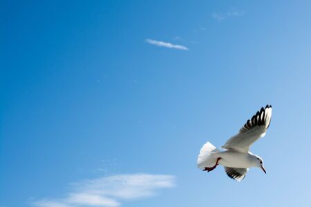 Single seagull flying in a blue sky background