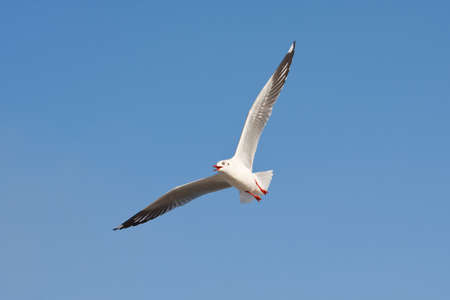 White winged gull soars freely in the blue sky