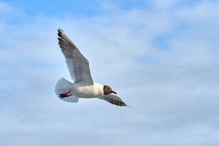 Open wings seagull flying over blue sky with clouds.