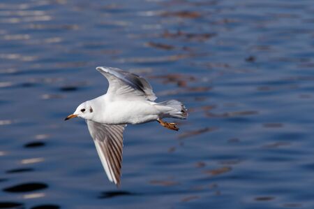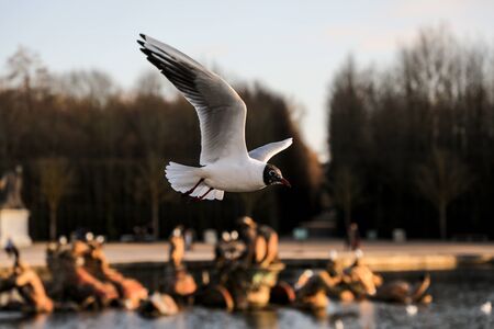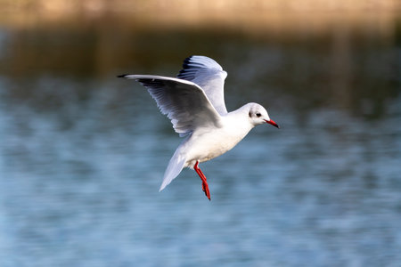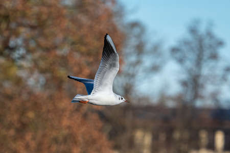 Closeup of a Black-Headed Gull, Chroicocephalus ridibundus flying over a lake in the English Garden in Munich, Germany. Adult winter plumage