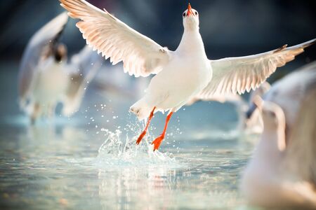 Seagull, the birds migrate from Siberia to Bangpu Samutprakhan Thailand, are feeded by traveler during sunset. fly over the sea and eating on the water surface.