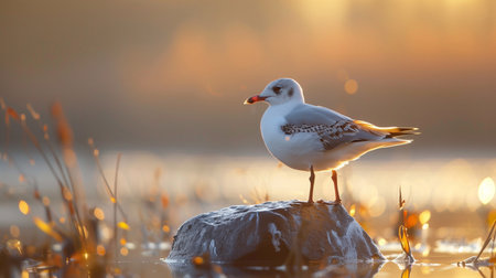 A gull perched atop a rock gazes out across still waters, surrounded by gentle hues of sunset lighting the atmosphere