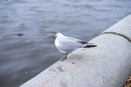Seagull standing on a concrete parapet on the river bank