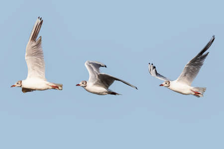 Photo Composition of black-headed gull (Chroicocephalus ridibundus) in flight in the Nature Reserve of Marismas de Odiel, Huelva, Andalusia, Spain