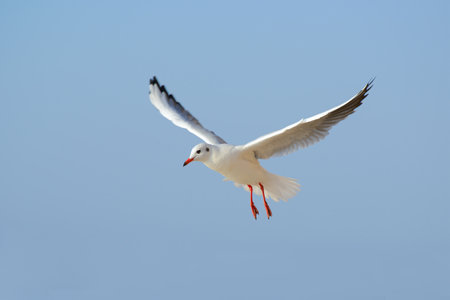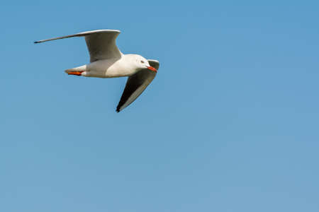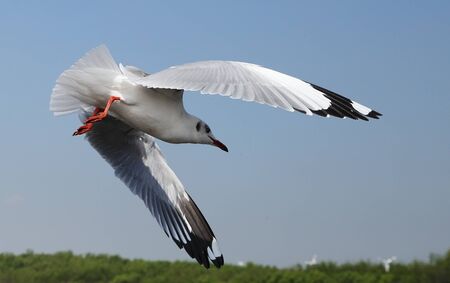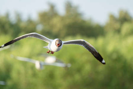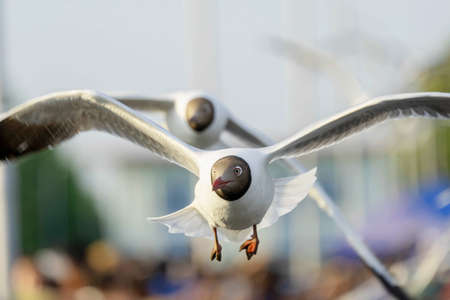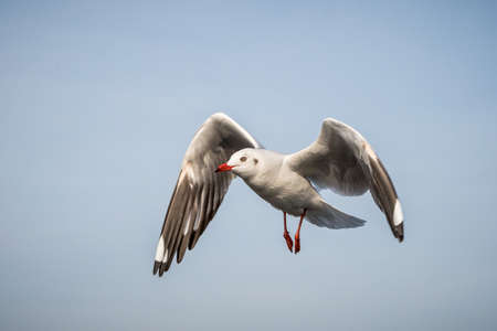 Seagull bird flying on nature background. Close up view of bird seagull flying in sky at Bangboo Samut Prakan Thailand.