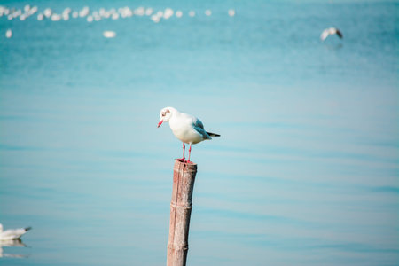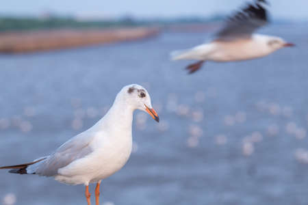 Seagull standing on a bridge, background, flocks of seagulls flying.at Bangpoo, Thailand.