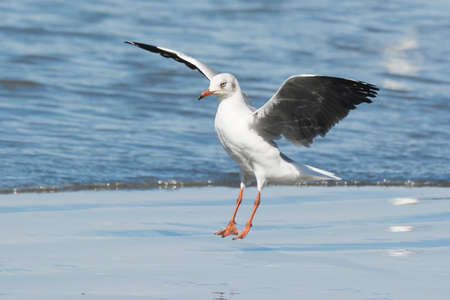A Grey-Headed Gull Larus cirrocephalus landing on the beach
