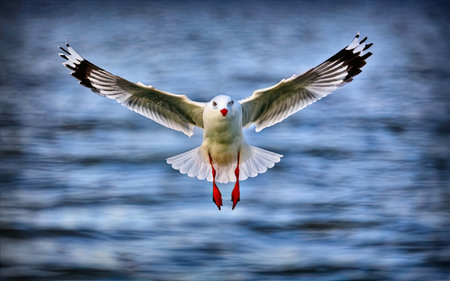 Seagull flying over the blue water