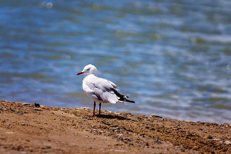 A Seagull strolling near a sea for food