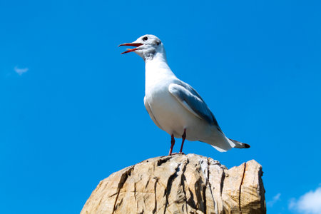 A white seagull perched on a wooden post against a bright blue sky. The bird is vocalizing, with its beak open, showing its feathers and stance.