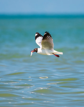A Brown-headed Gull clutching a freshly caught fish in its beak, a moment of its successful hunt