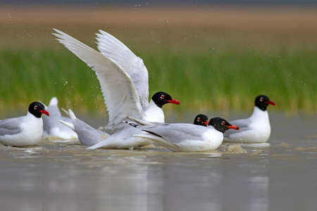 Group of Mediterranean gulls floating on the water (Larus melanocephalus)